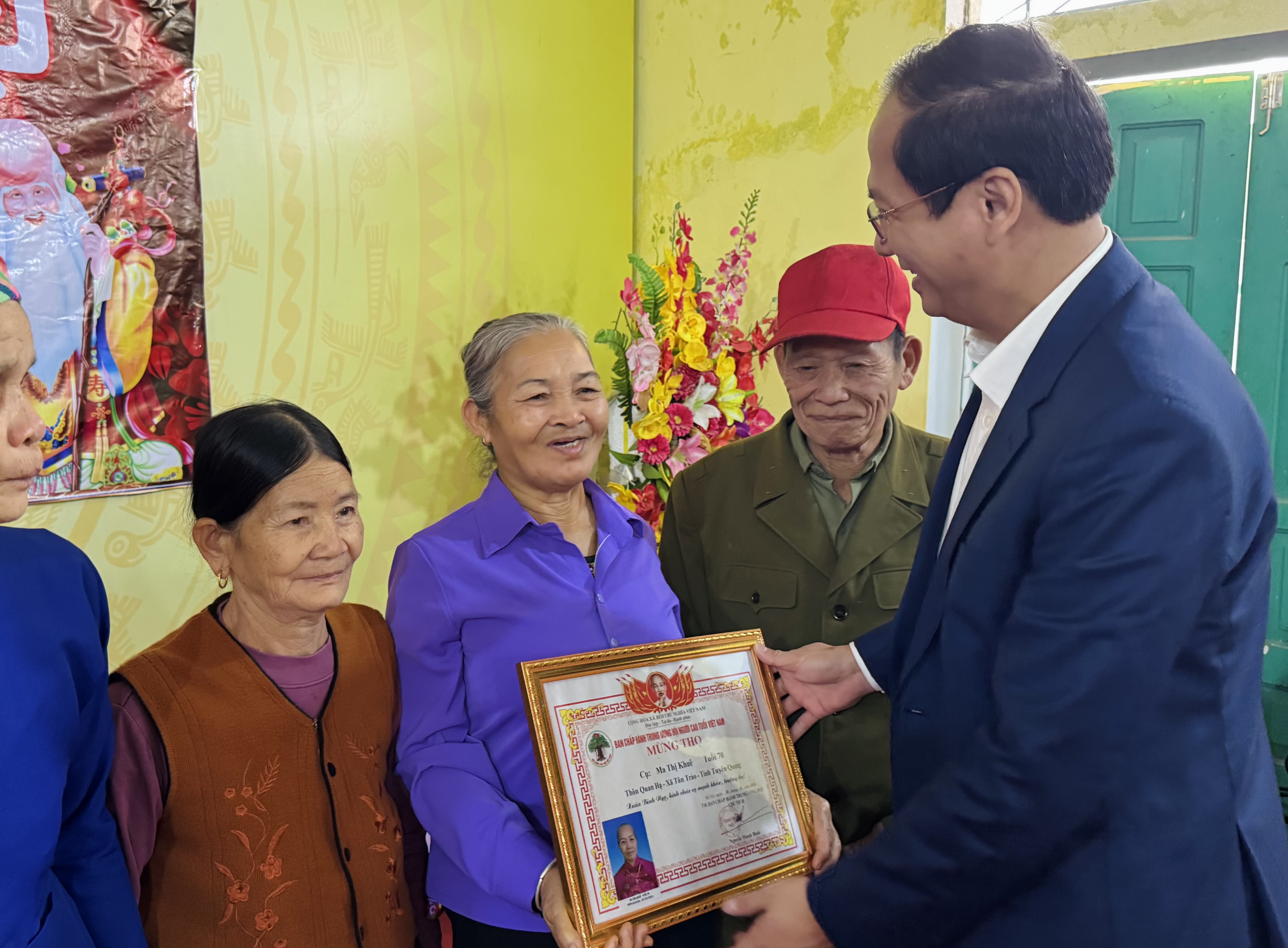 Đồng chí Giang Tuấn Anh trao mừng thọ cho cụ Ma Thị Khuê.