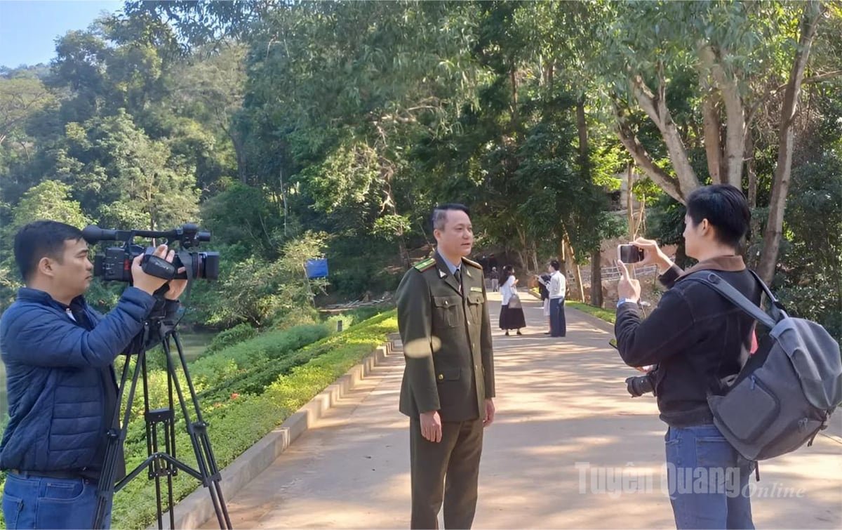 Các phóng viên thực hành tác nghiệp sản phẩm báo chí đa phương tiện tại Khu di tích Quốc gia đặc biệt Tân Trào.