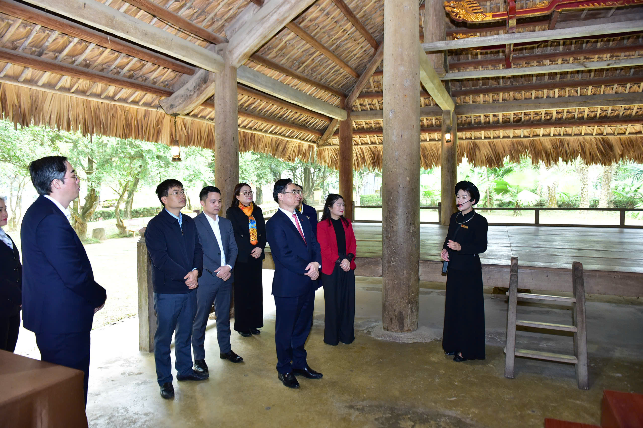 Đoàn công tác Tạp chí Cộng sản do PGS.TS Dương Trung Ý, Ủy viên BCH Trung ương Đảng, Tổng Biên tập làm Trưởng đoàn nghe thuyết minh về giá trị lịch sử của Đình Tân Trào.