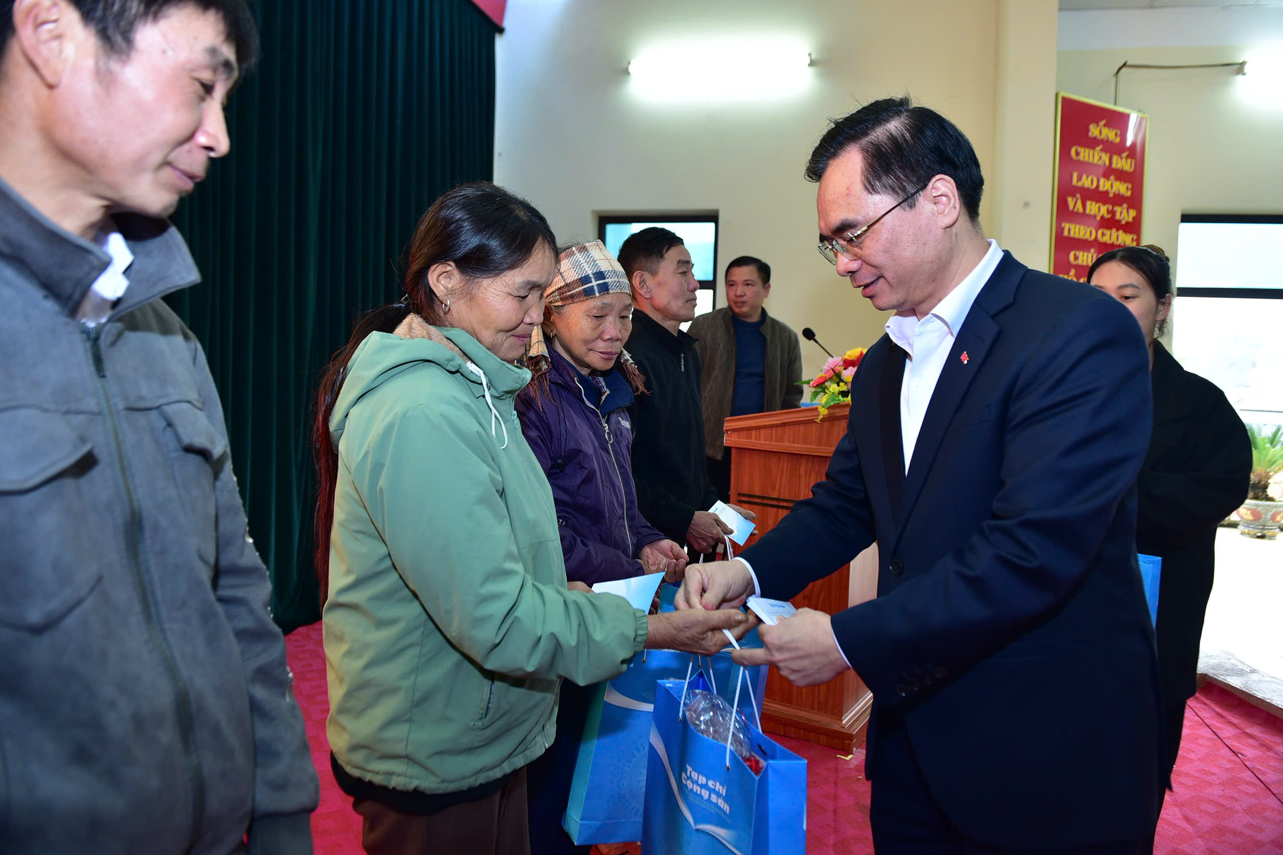 Tổng Biên tập Tạp chí Cộng sản Dương Trung Ý tặng quà các hộ gia đình khó khăn tại xã Tân Trào.