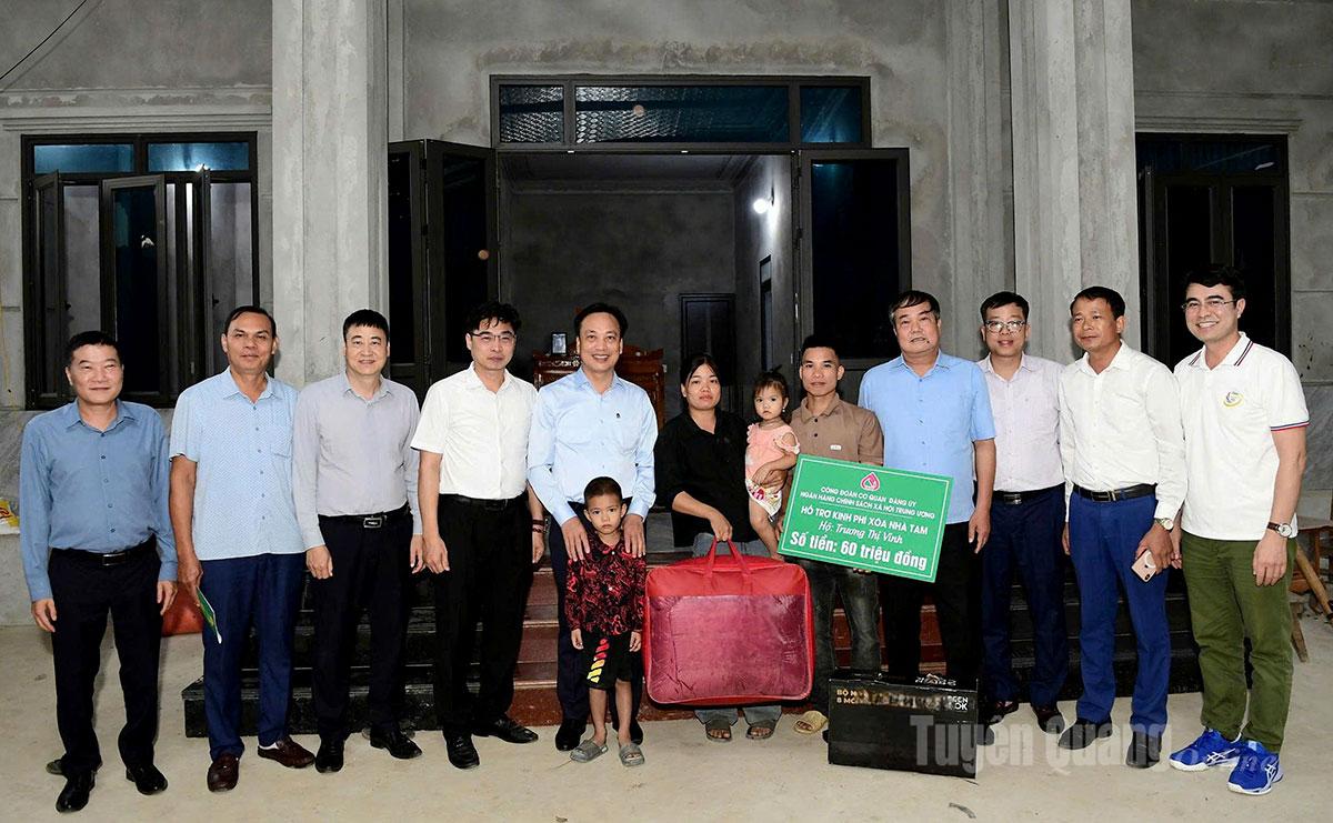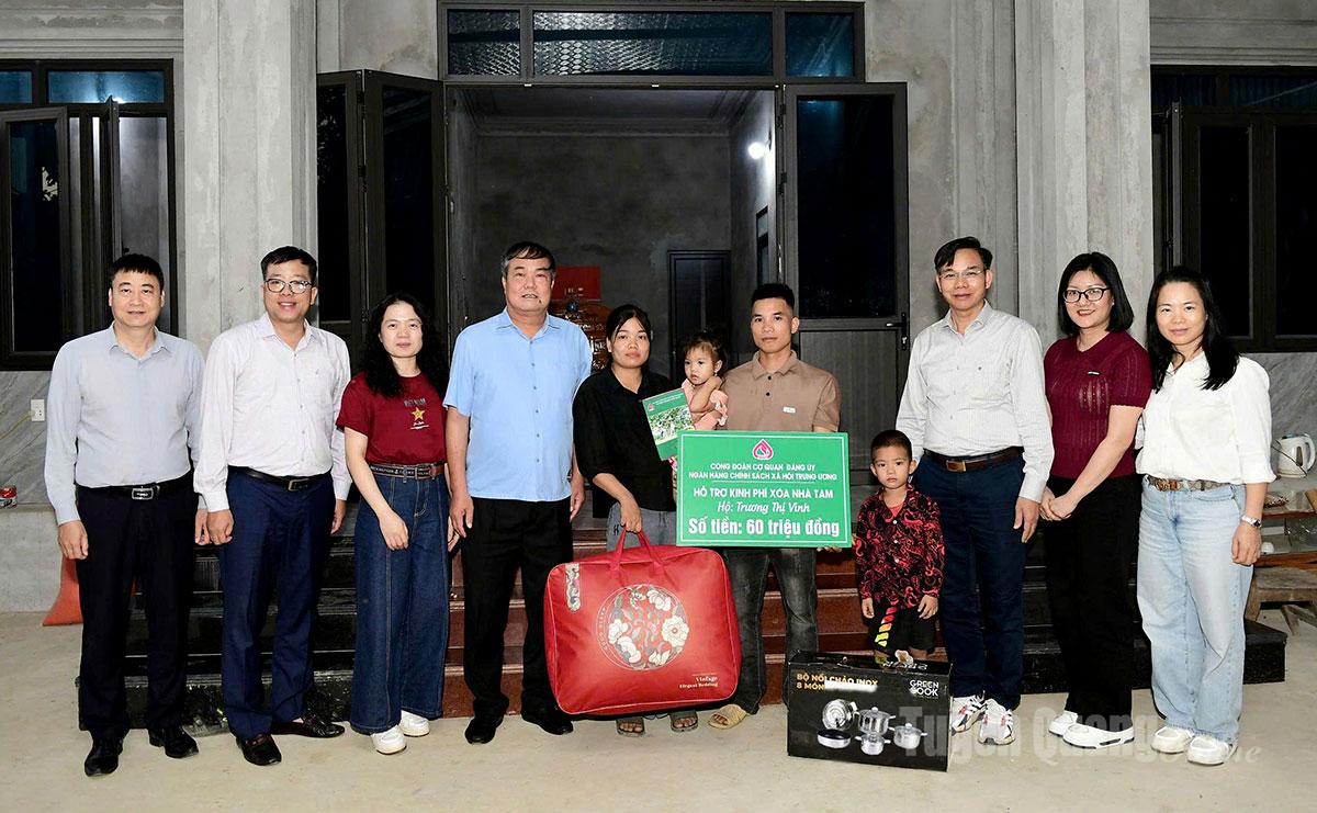 Lãnh đạo Đảng ủy Chính phủ, Đảng ủy Ngân hàng Chính sách xã hội Việt Nam, Chi nhánh Ngân hàng Chính sách xã hội tỉnh trao kinh phí hỗ trợ xóa nhà tạm cho gia đình bà Trương Thị Vinh, thôn Sơn Hạ, xã Xuân Vân.