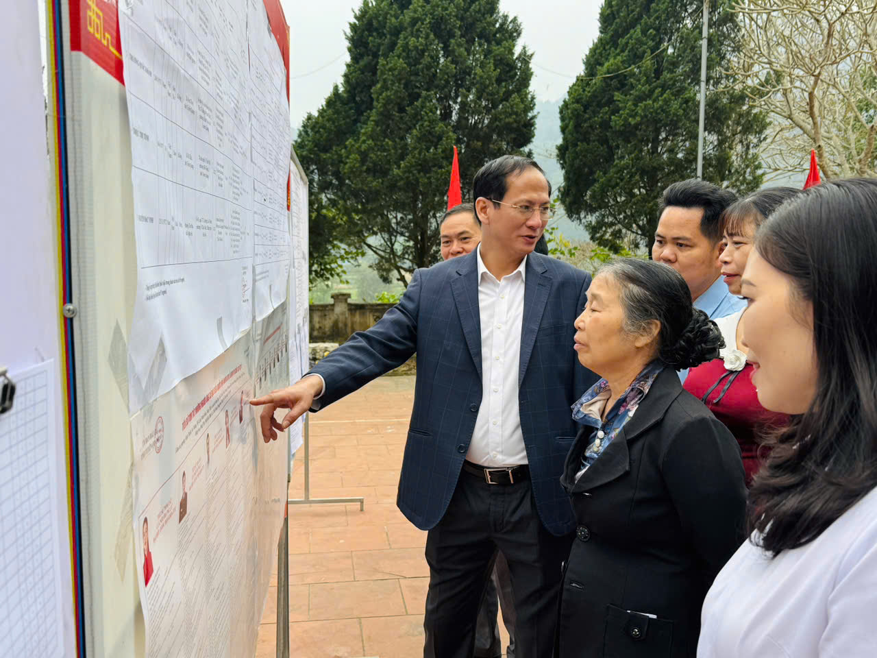 Đồng chí Bí thư Đảng ủy Giang Tuấn Anh kiểm tra công tác bầu cử tại Nhà văn hóa thôn Cả - Khu vực bỏ phiếu số 04 xã Tân Trào.