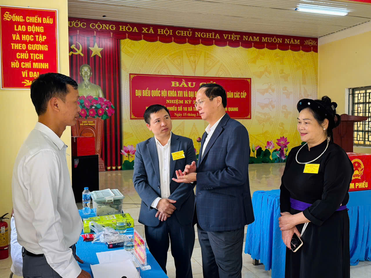 Đồng chí Bí thư Đảng ủy Giang Tuấn Anh trao đổi với cán bộ Tổ bầu cử Khu vực bỏ phiếu số 10, xã Tân Trào về công tác bầu cử.