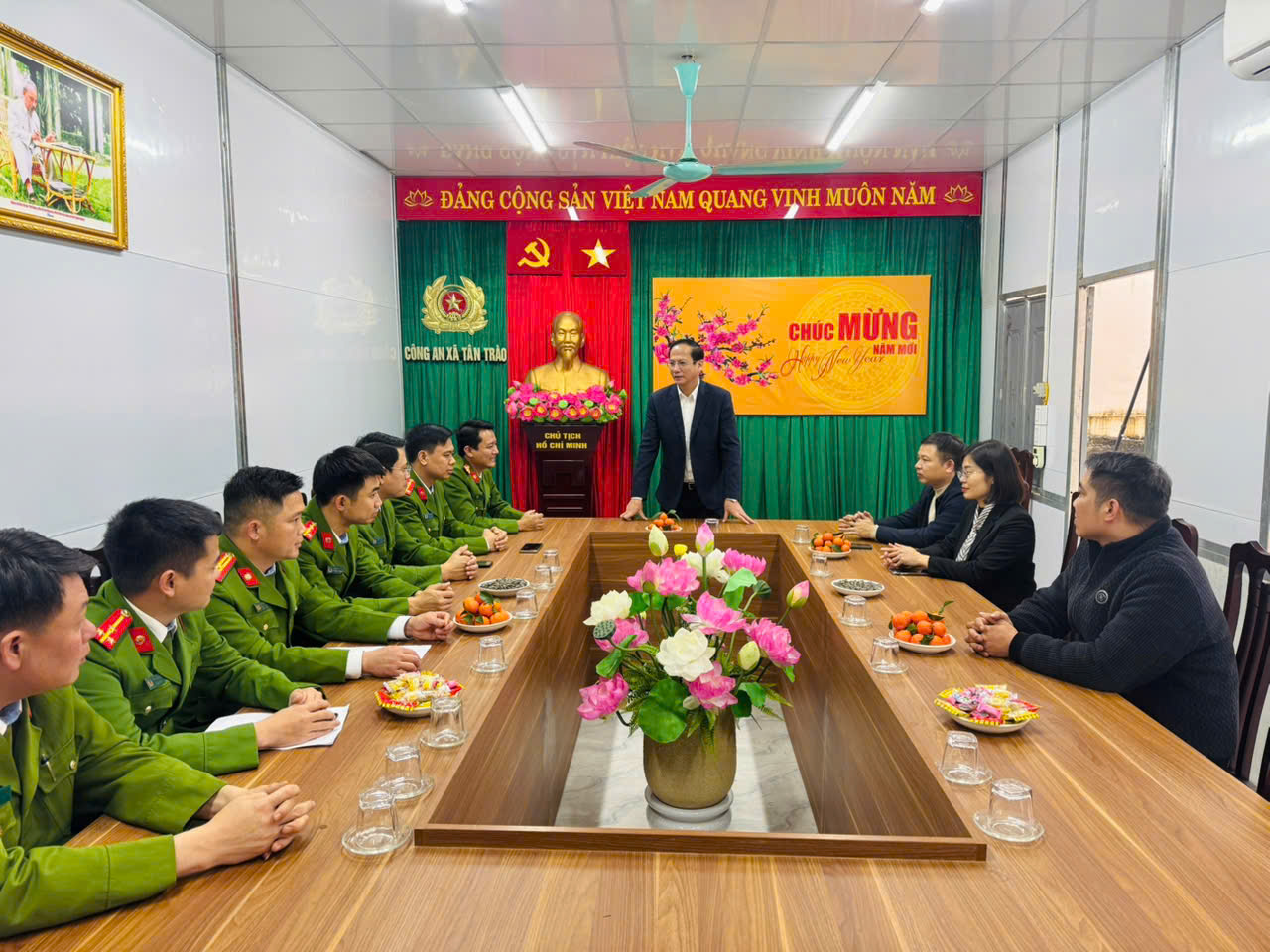 Nhân dịp năm mới, đồng chí Giang Tuấn Anh đã gửi lời chúc mừng năm mới tới toàn thể cán bộ, chiến sĩ Công an xã, chúc đơn vị tiếp tục phát huy truyền thống, hoàn thành xuất sắc nhiệm vụ trong năm 2026.