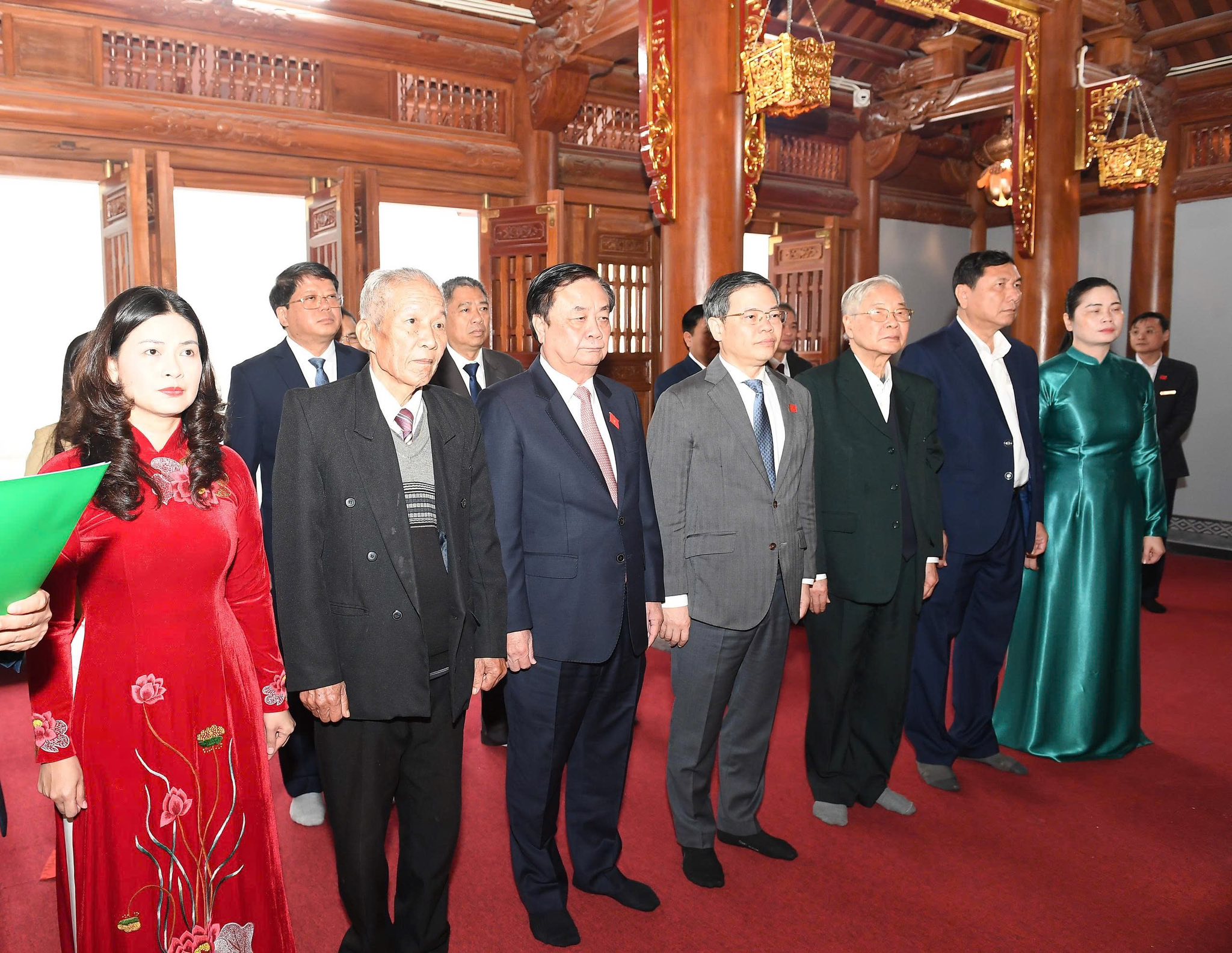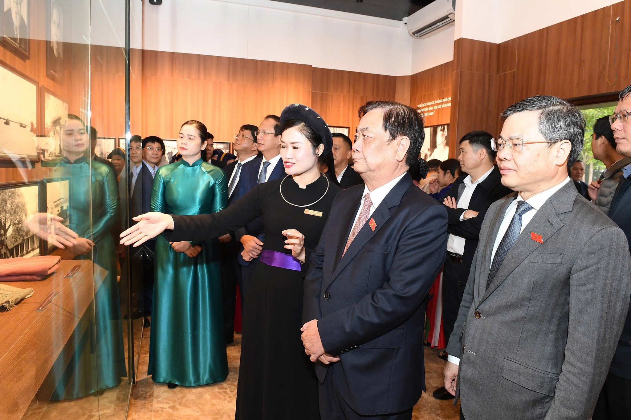 Phó Chủ tịch Quốc hội Lê Minh Hoan và các đại biểu nghe thuyết trình tại nhà trưng bày Khu di tích Ban Thường trực Quốc hội.