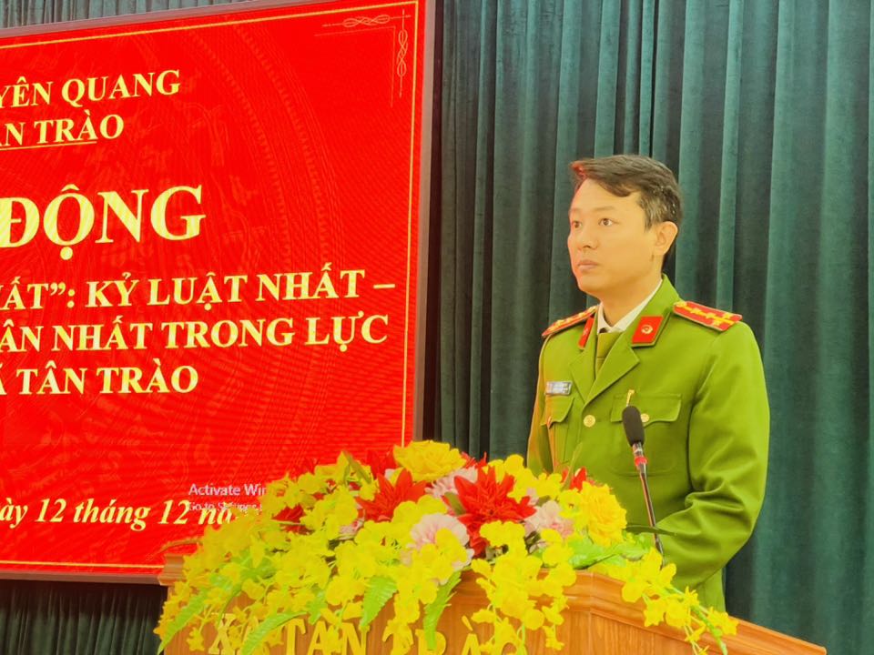 Dự và chỉ đạo buổi lễ có các đồng chí Dương Minh Tuấn, Phó Bí thư Đảng ủy, Chủ tịch UBND xã; Vũ Hoài Nam, Ủy viên Ban Thường vụ Đảng ủy, Trưởng Công an xã; lãnh đạo các phòng, ban chuyên môn; chỉ huy và cán bộ, chiến sĩ Công an xã Tân Trào.