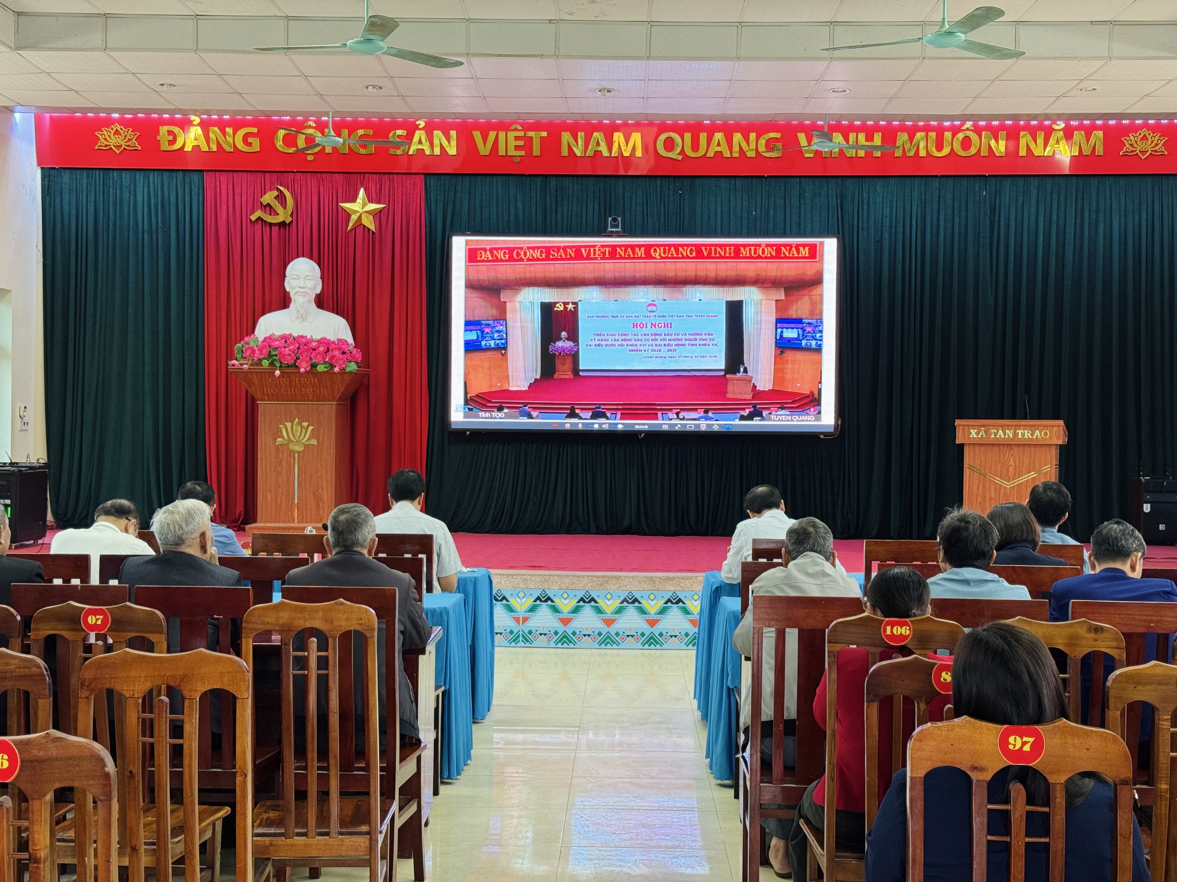 Dự tại điểm cầu xã Tân Trào có các đồng chí Giang Tuấn Anh, Bí thư Đảng uỷ, Chủ tịch HĐND xã; Hoàng Văn Niên, Phó Bí thư Thường trực Đảng uỷ; Dương Minh Tuấn, Phó Bí thư Đảng uỷ, Chủ tịch UBND xã; lãnh đạo các cơ quan, đơn vị trên địa bàn và những người có tên trong danh sách chính thức ứng cử Đại biểu HĐND xã khoá XXII, nhiệm kỳ 2026-2031.