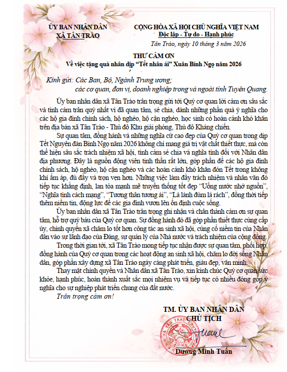 Ghi rõ nguồn 'Cổng Thông tin điện tử xã Tân Trào' hoặc 'www.tantrao.tuyenquang.gov.vn' khi phát hành lại thông tin từ các nguồn này.